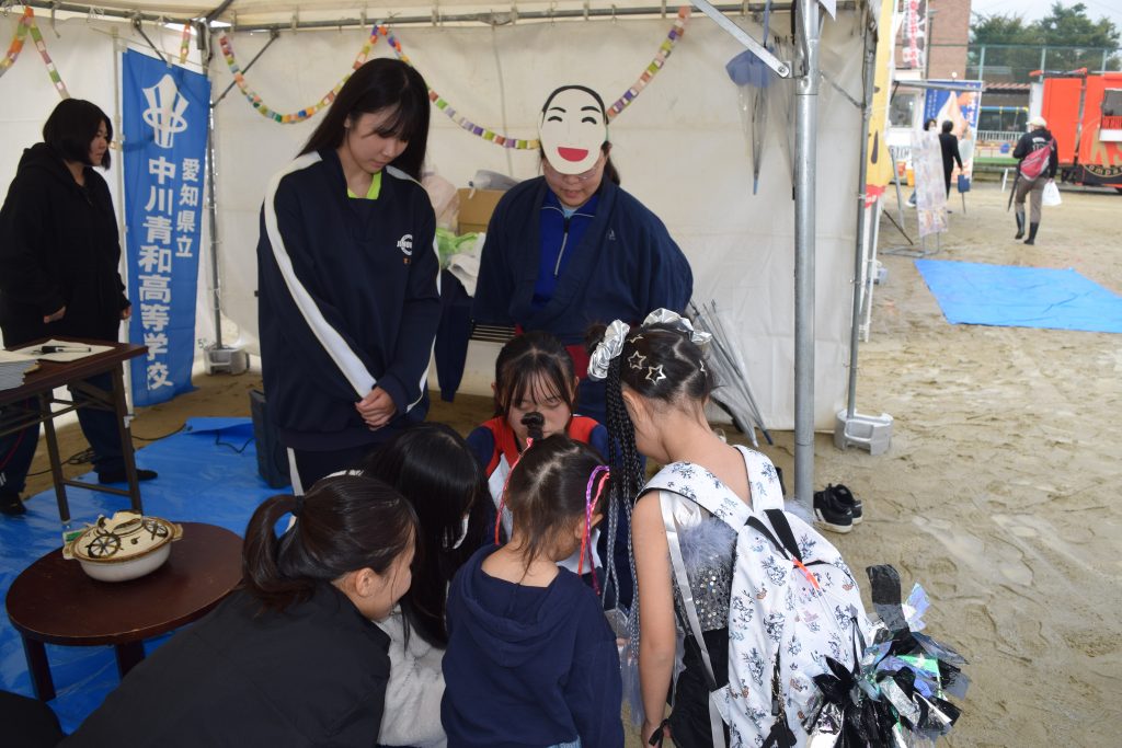 令和7年10月26日(日)露橋公園で行われた「令和7年度 中川区区民まつり」に、3年次生課題研究「エリアビジネスプロジェクト」のメンバーが参加しました。中川区発祥の伝統野菜「野崎白菜」の紙芝居劇を中心に地域の方々と交流しました。雨の中でも積極的に呼び込みを行い、中川青和高校の生徒が活躍しました。