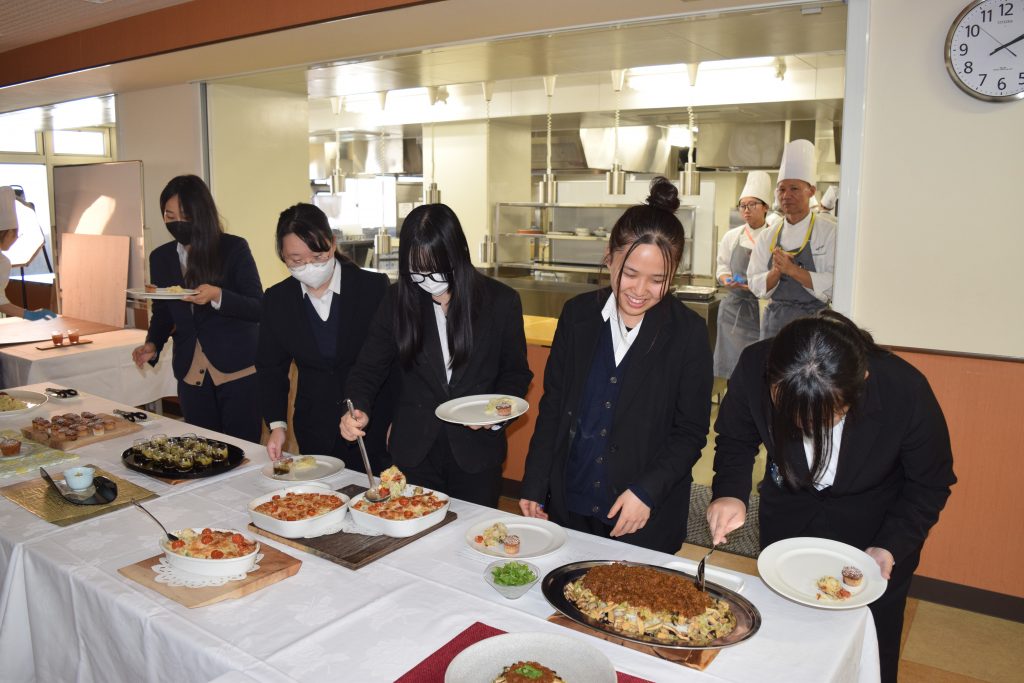 令和7年11月21日(金)3年次生課題研究「エリアビジネスプロジェクト」講座のメンバーが、名古屋調理師専門学校で行われた試食会に参加しました。今年度は野崎白菜、miuトマト、ブロッコリーの地元野菜を活用した料理レシピを共同で開発しています。本校は主にレシピのイラストのデザイン、レシピのタイトル考案、野崎白菜等の説明文を考えています。具体的なレシピの内容は専門学校で考案され、今回の試食会が実現しました。専門学校の学生の方々とも交流することができました。料理のレシピの完成が待ち遠しいです。
