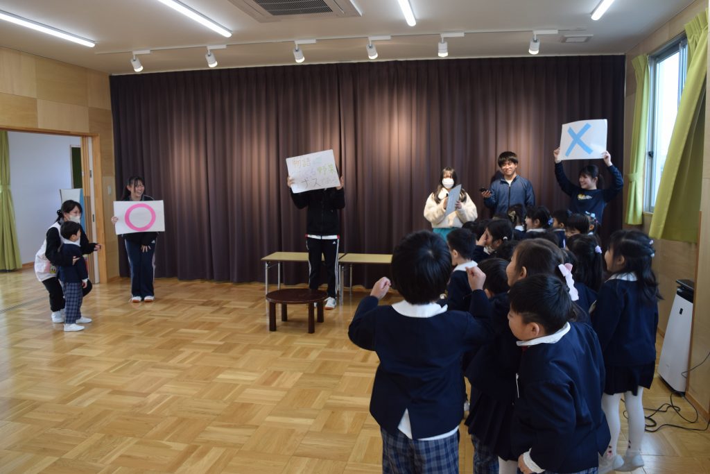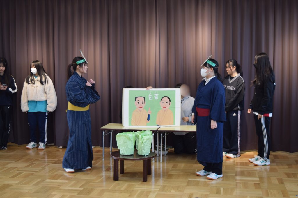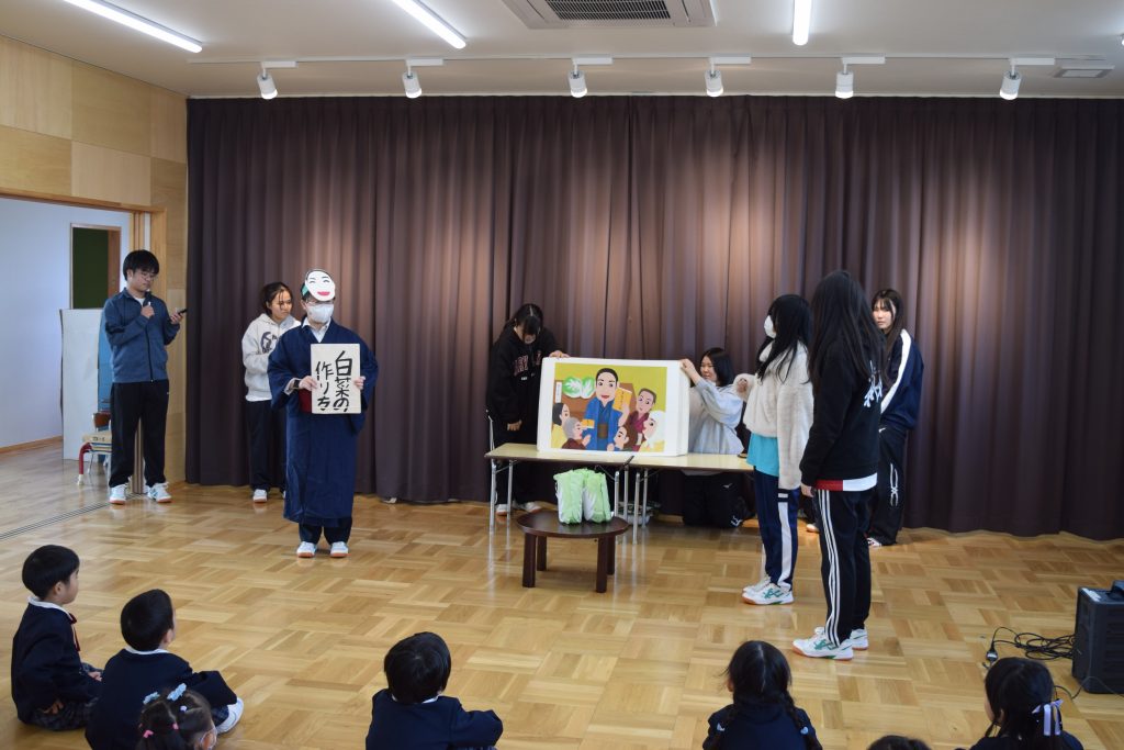 令和7年12月3日(水)五反田幼稚園にて、3年次生課題研究「エリアビジネスプロジェクト」のメンバーが出前授業を行いました。野崎白菜誕生の紙芝居と、はくちゃんダンスを園児たちと一緒に踊りました。園児たちはとても喜んでくれて、私たちも嬉しい気持ちになりました。野崎白菜の伝統を伝えるとともに、素敵な時間を過ごすことができました。