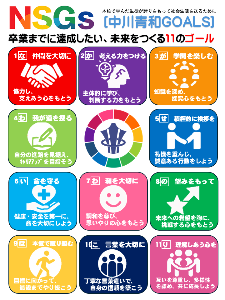 これを「SDGs」にちなんだ、ローカルSDGsとして本校独自に「NSGs」と題しました。各クラスや校内に掲示し、普段の学校生活や学校行事、授業などを通し目標達成をめざします!